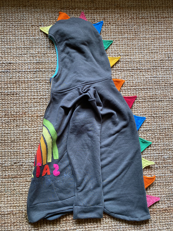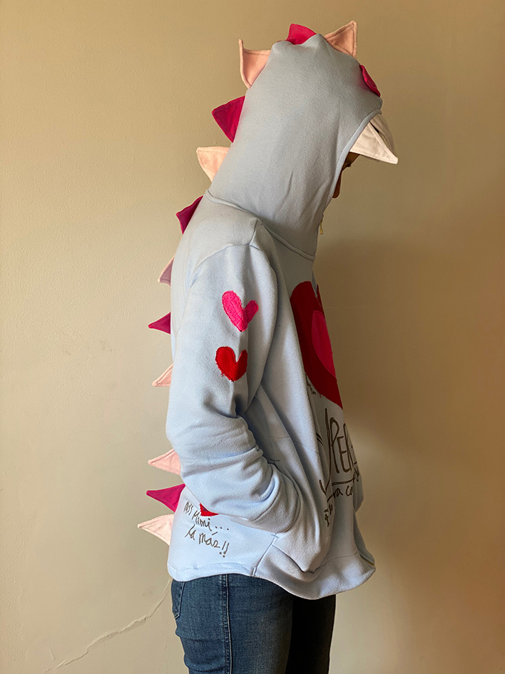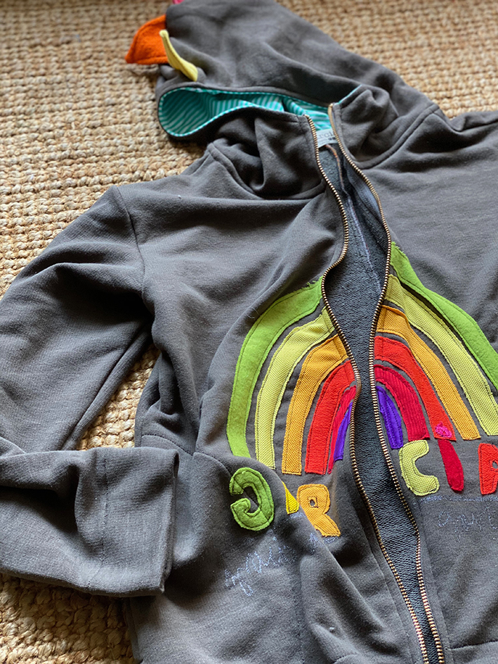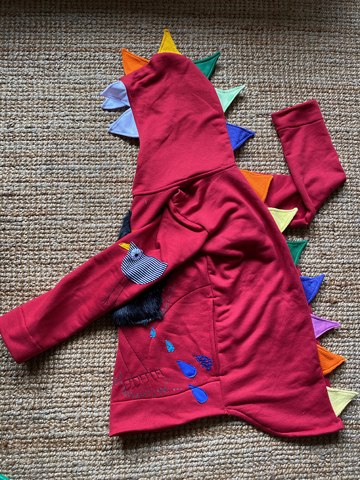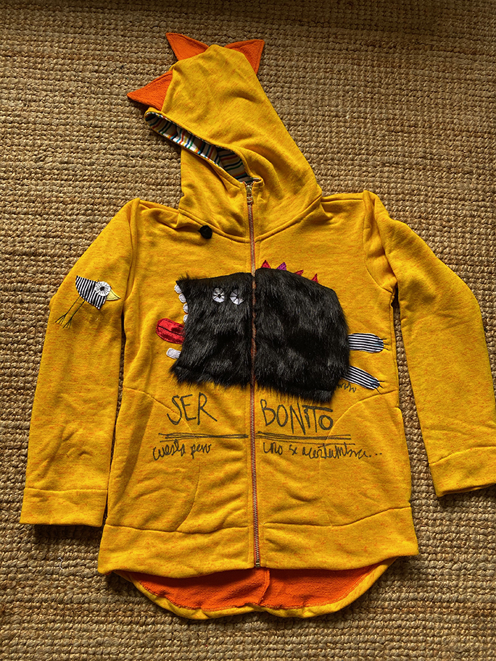 Chaqueta divertida con apliques, corte en la espalda más largo, capucha y bolsillos laterales.